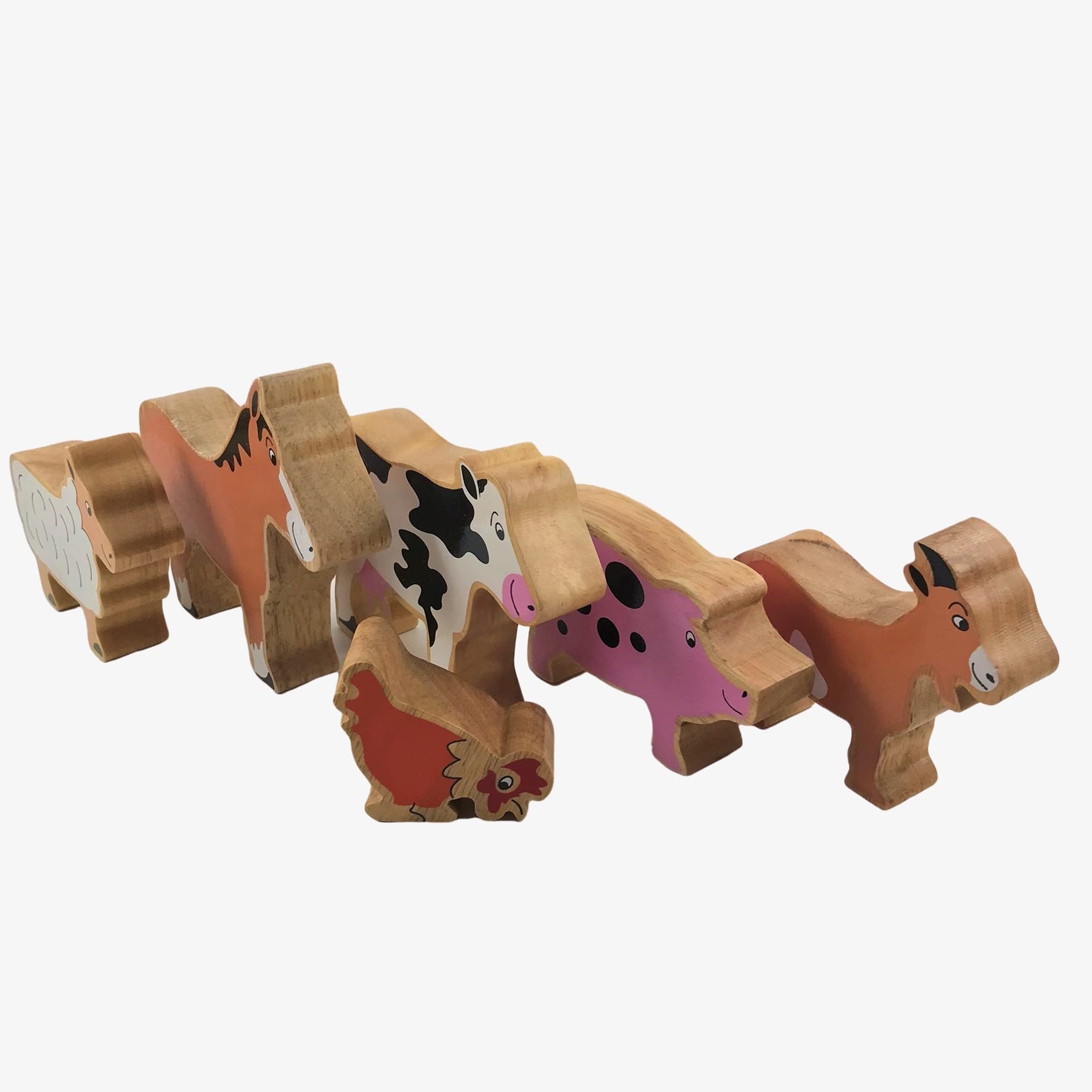 Pig, Sheep, Horse, Cockerel, Cow and goat all handcrafted from Rubberwood and painted beautiful, vibrant colours.